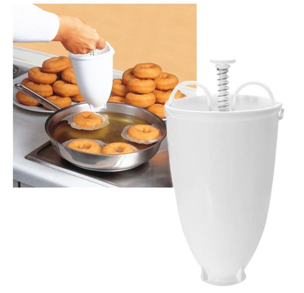 Приспособления для дозирования теста обычно имеют коническую форму. Отверстие в нижней части определяет размер кондитерского изделия. В устройствах, выдающих разные по величине и типу заготовки, меняются детали. Кольца определяют, какой величины будет пончик. Чтобы получить оладьи и панкейки, вынимается узел создания отверстий.