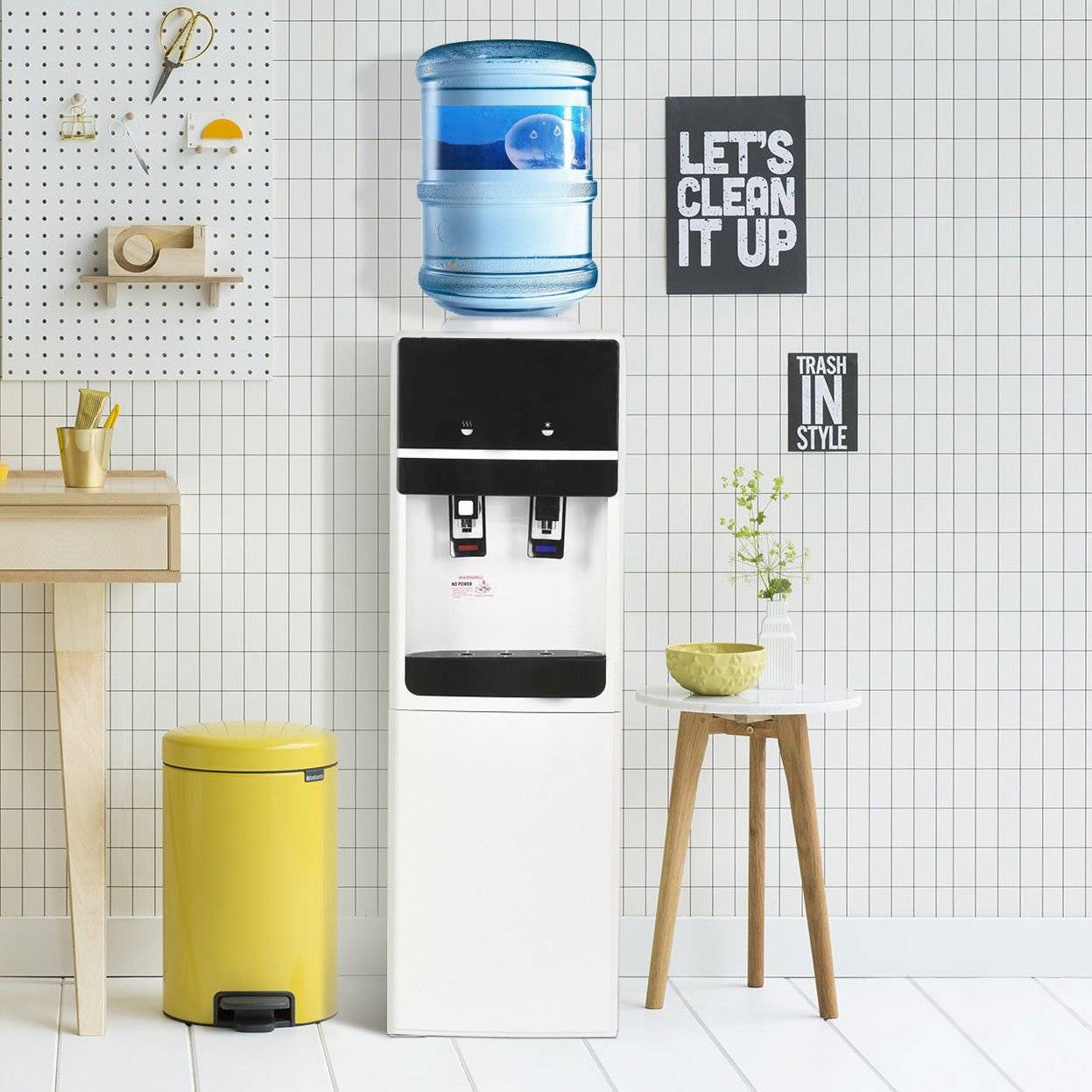 - Напольные. Отдельно стоящие шкафчики высотой от 80 см, имеют разный дизайн. Модель может поставляться с нижней или верхней загрузкой бутыли. Напольные устройства отличаются высокой производительностью и функциональностью. Они используются, если нужна охлажденная или горячая вода, могут работать с высокой скоростью, поэтому чаще устанавливаются в крупных компаниях.