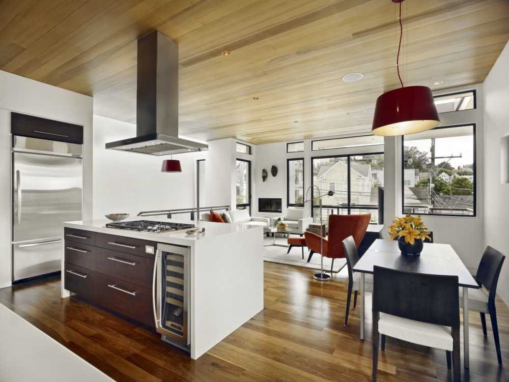 Кухня, совмещенная с гостиной, приобретает все больше популярности последнее время. В таких помещениях в приоритете установка закрытых гарнитур, где в продолжении одной стороны кухни с диваном встроен обеденный стол со стульями. Это позволяет выделить пространство и подчеркнуть индивидуальность стиля, а также, возможность не устанавливать какие-либо перегородки, таким образом увеличивая количество света в комнате.