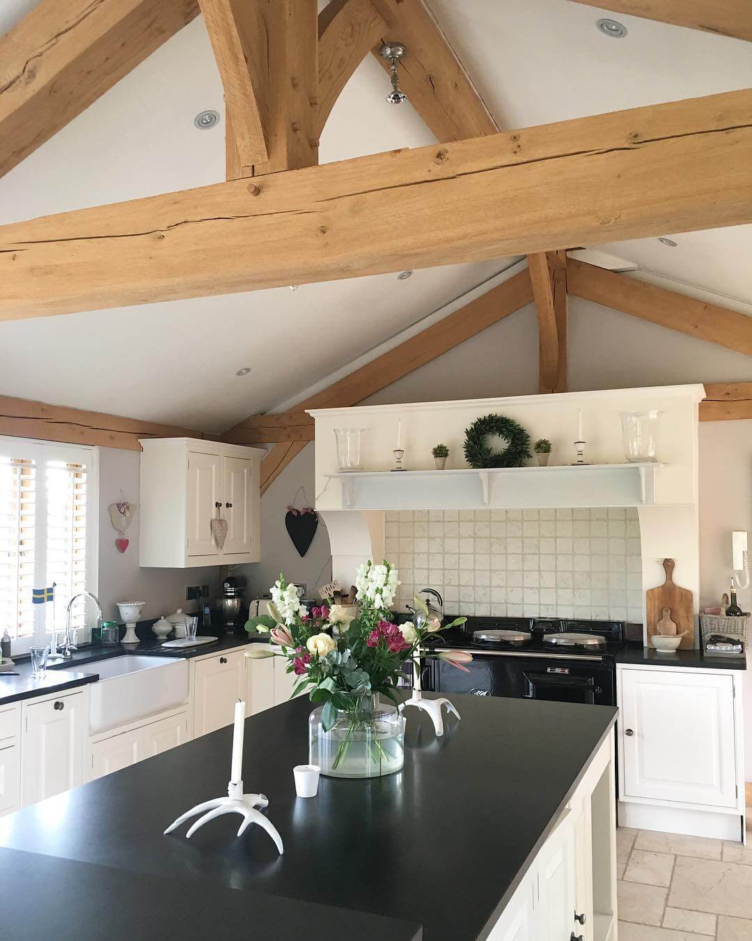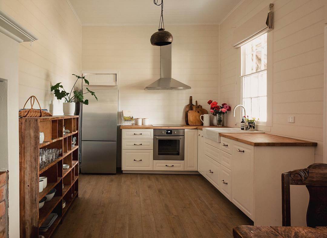 Потолок лучше всего оставить белым – покрасить или побелить. Если есть желание внести разнообразие в белое пятно над головой и усилить эффект деревенского колорита, добавьте грубых деревянных балок над головой.