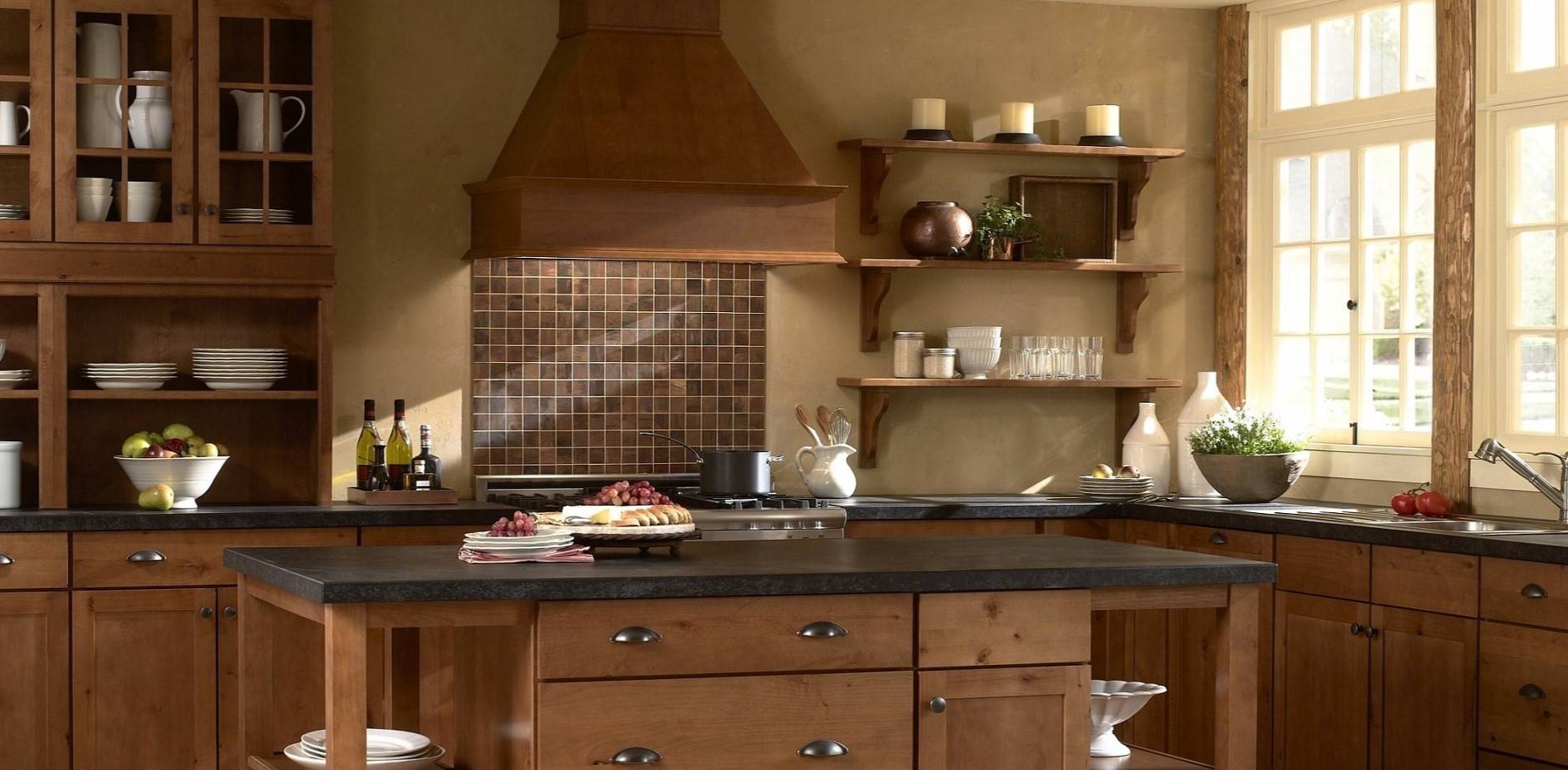 Иногда фасады шкафчиков просто вскрывают лаком, сохраняя при этом естественную текстуру материала. Дверцы секций могут быть украшены резьбой, цветными узорами или стеклянными вставками, через которые будет видна красивая посуда, соответствующая направлению. Обеденный стол нужно поставить в центре комнаты, а вокруг него разместить табуреты или стулья.