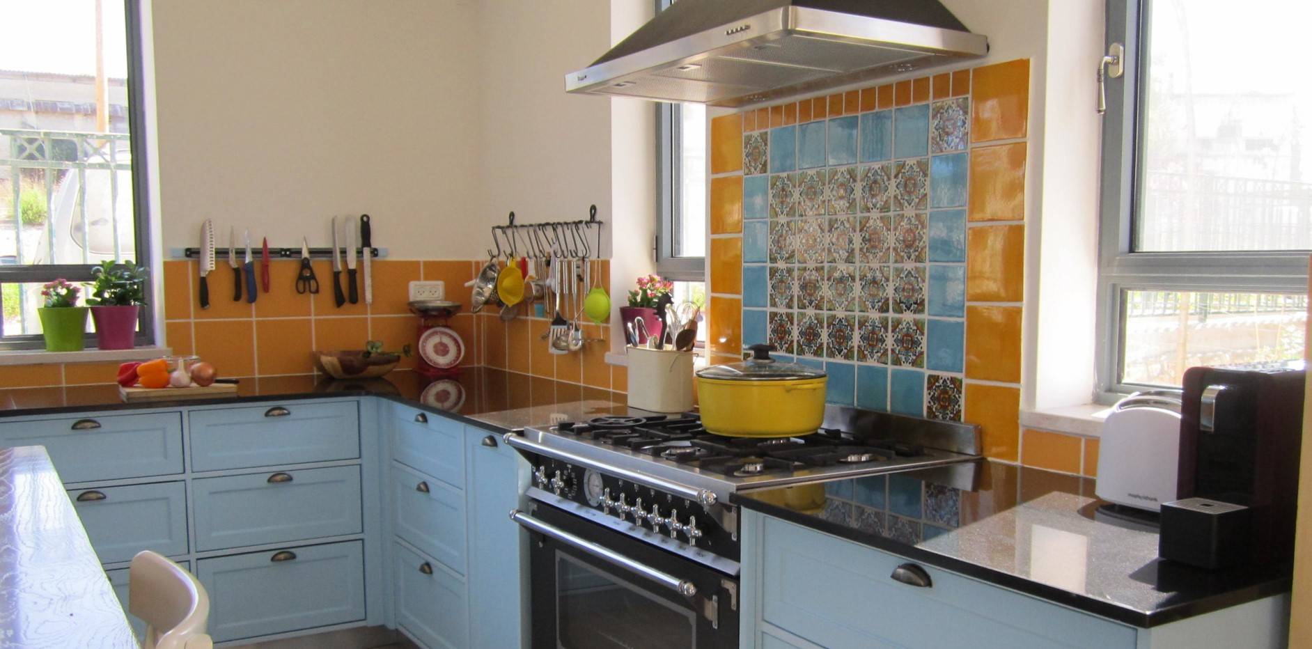 Голубая плитка в сочетании с оранжевым