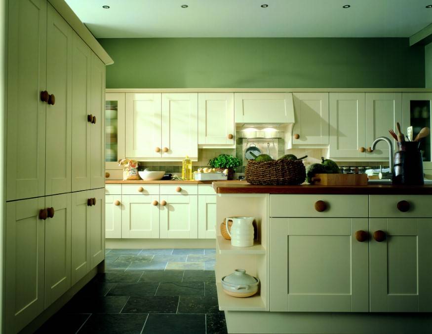 Мебельные гарнитуры для кухни, оформленной в стиле кантри, должны быть только из натурального дерева, как правило, это массив или шпон.Цвет кухонной мебели чаще бежевый или оливковый.