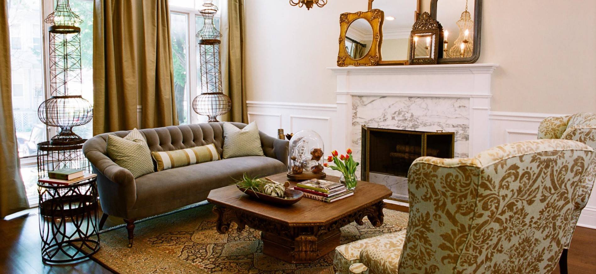 Кресла с цветочным орнаментом и диван на деревянных ножках отлично дополняют интерьер