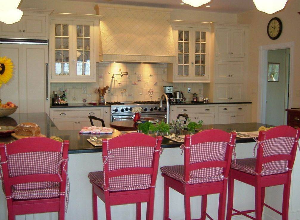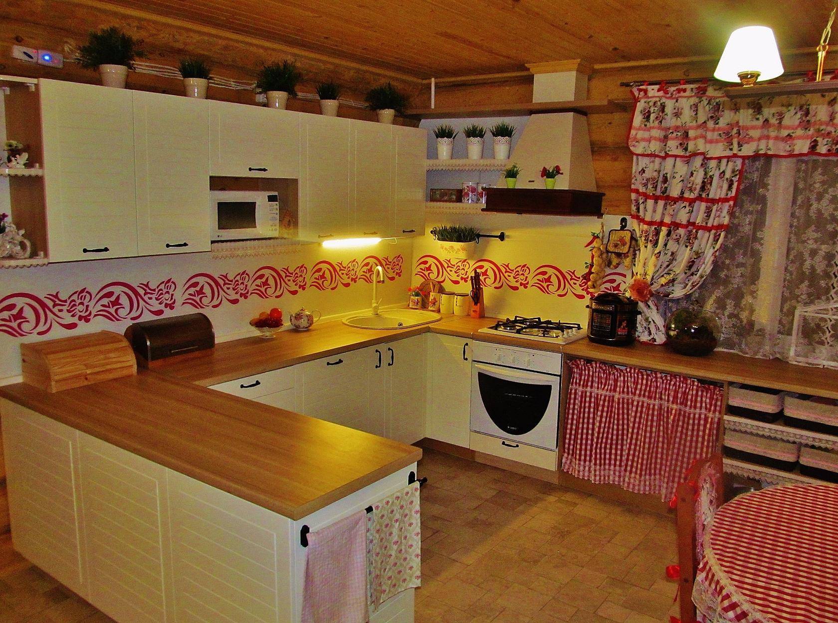 Стены и потолок сделать белыми, красный цвет должен присутствовать в текстиле – в виде красных клетчатых занавесок на окнах, клетчатой скатерти, небольшого коврика под обеденным столом. Тарелки и некоторая кухонная утварь (например, кастрюли, выставленные на видном месте) могут быть красного цвета).