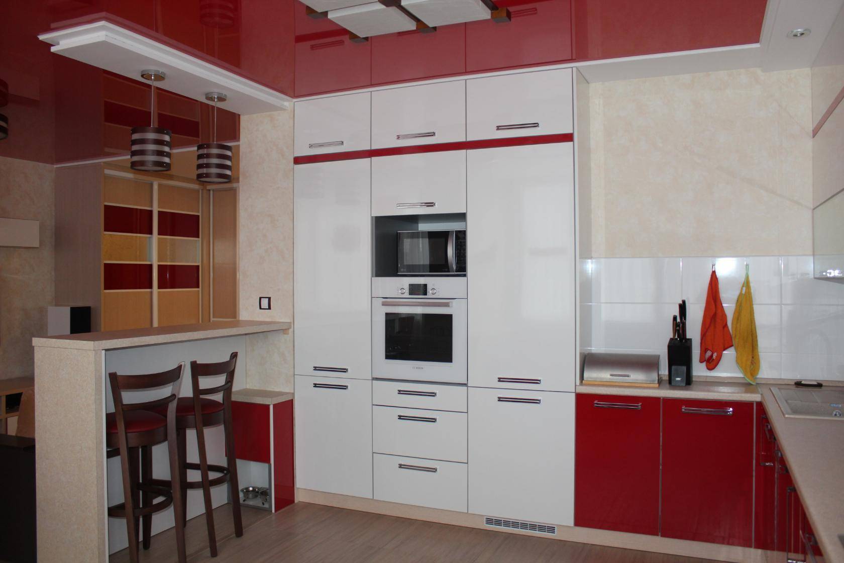 Комбинировать в интерьере красный гарнитур с белым потолком, светлыми стенами и глянцевым полом.