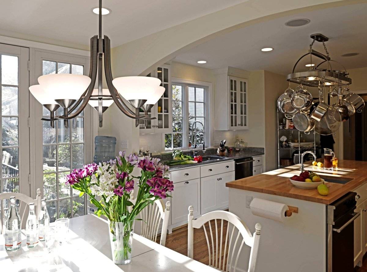 Это большое преимущество, когда через большие окна можно добиться естественного яркого света, но часто это невозможно. Поэтому главную роль берут на себя люстры и светильники. Они не должны быть слишком маленькими, чтобы при входе на кухню взгляд останавливался на них.