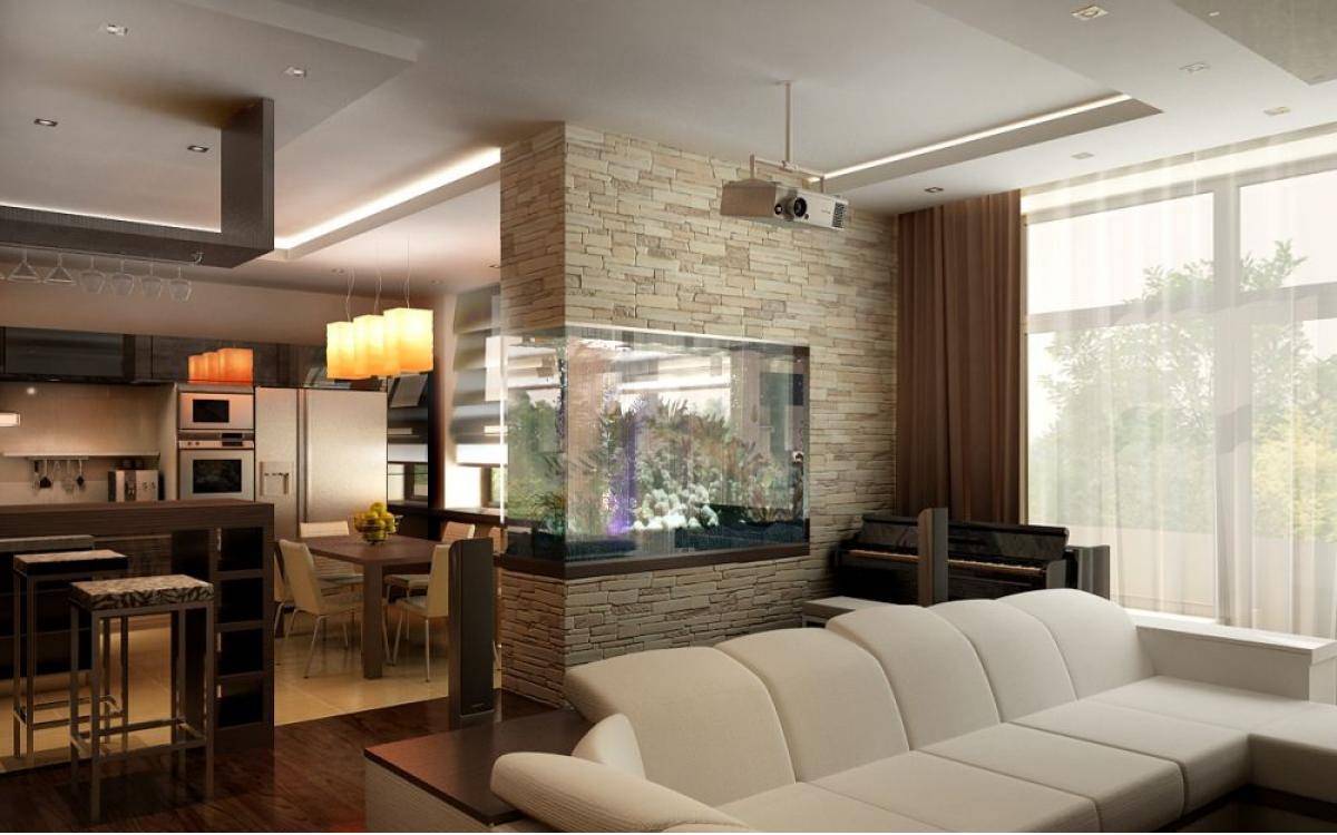 Привлекательно выглядит встроенный в перегородку между комнатами аквариум. Его внушительные габариты и наличие в нем разнообразных рыбок придадут дизайну оригинальности.