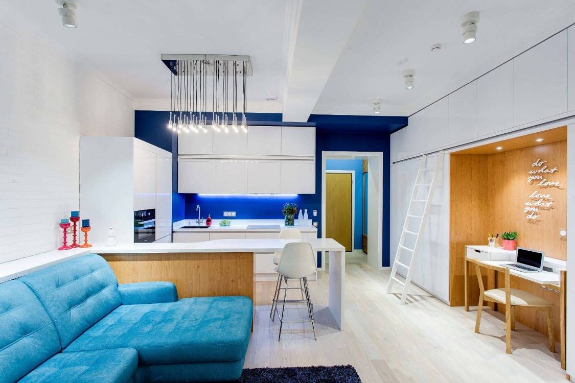 При разработке дизайна в студии кухни-гостиной 30 кв. м, как на фотографии, необходимо учитывать такие важные моменты: