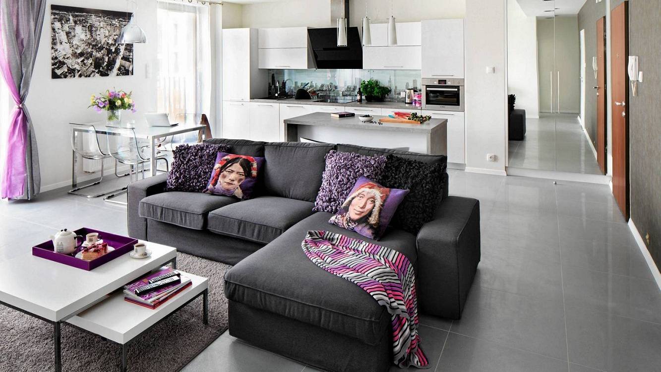 Перегородки или раздвижные конструкции станут настоящим украшением интерьера. Они могут быть прозрачными или матовыми, изготовленными из стекла или гипсокартона. Оснащенные роликовыми механизмами, такие конструкции при желании задвигаются, не занимая при этом много места. Отгородить кухню от гостиной можно обычным диваном или софой. Отдавайте предпочтение многофункциональной раскладной мебели, чтобы было дополнительное пространство для хранения вещей, а также спальное место для гостей