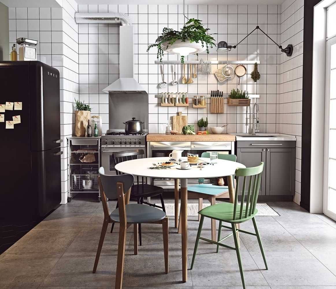 Скандинавский стиль в идеале строится на контрасте белого и темных глубоких оттенков. Но на маленькой кухне такое сочетание будет смотреться слишком тяжело и дополнительно уменьшать комнату, поэтому в отделке лучше отдавать предпочтение светлым материалам, а контраст добавлять в декор — это беспроигрышный вариант интерьера.