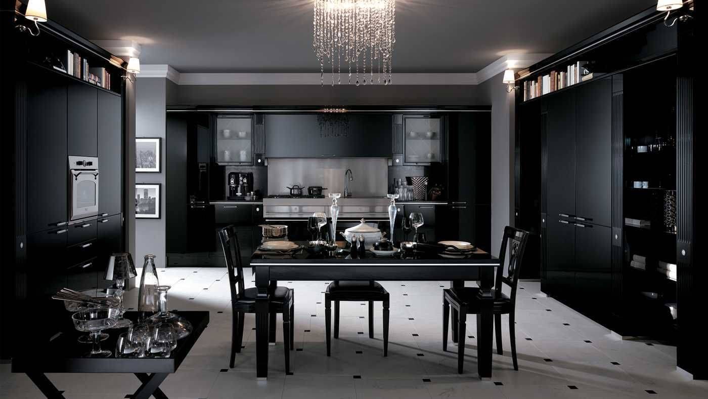 Вариант 3. Доминирование чёрного – самая редкая схема, главным образом из-за того, что мало кто решается делать из кухни мрачную пещеру. Несмотря на то, что в интерьере (в представленном примере) пол и потолок белые, всё равно очевидно, что чёрный цвет перевешивает. Именно введение дополнительных белых плоскостей создало относительное равновесие. Стоит помнить, что тёмные оттенки опасны: если их неправильно распределить, то можно элементарно разбалансировать цветовую атмосферу.