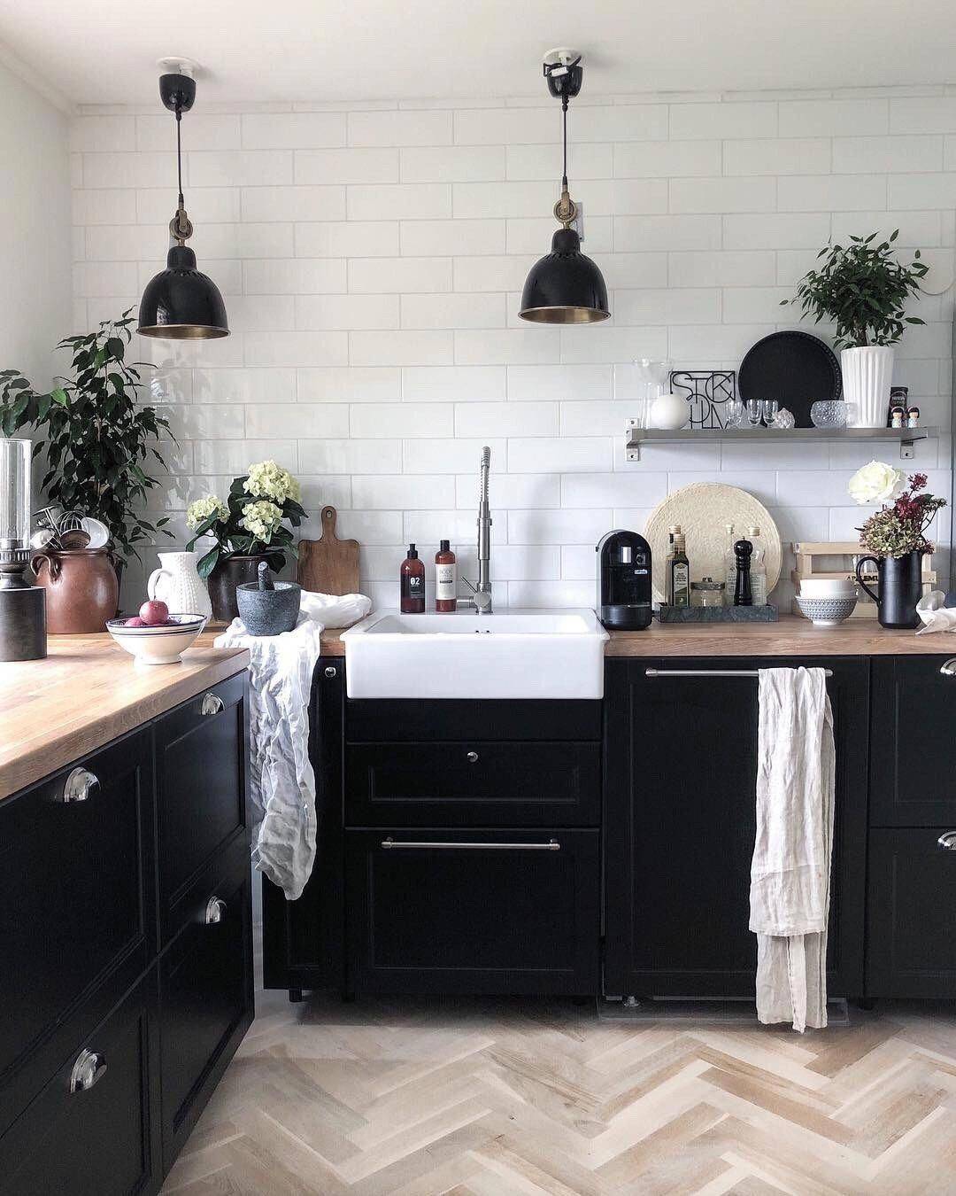 Главное — не забывать про любовь скандинавского стиля к натуральным материалам и природным цветам. Самое простое решение, которое приходит в голову: белый кухонный гарнитур из дерева, разбавленный темной контрастной столешницей.