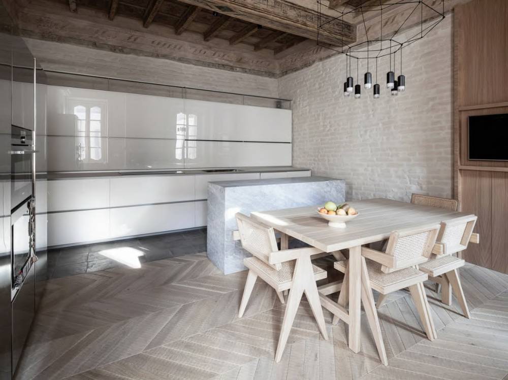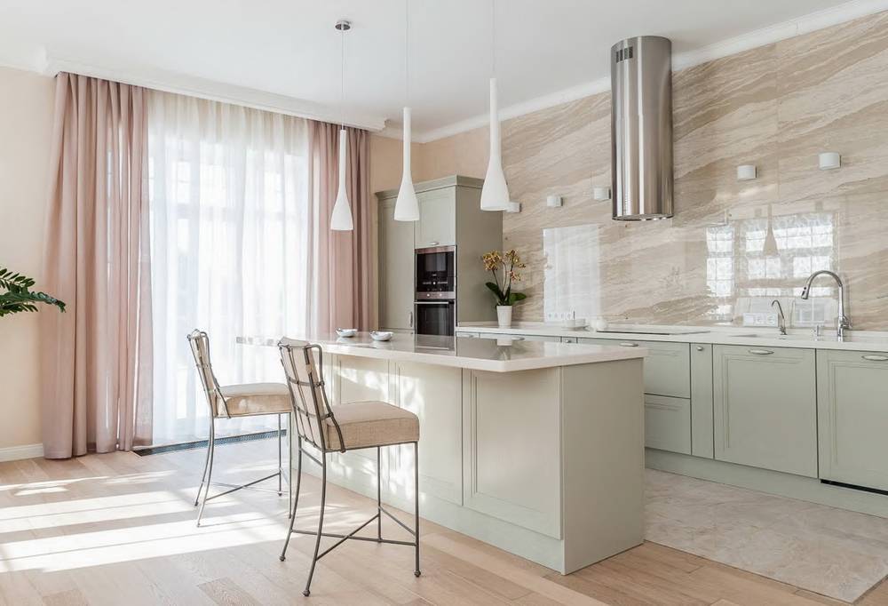 Для зонирования используют остров или большой обеденный стол. Такой стиль подойдёт для просторной кухни-гостиной в загородном доме, на маленькой площади в квартире будет смотреться нелепо.