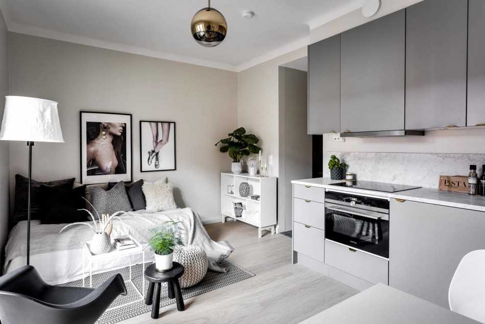 Для однокомнатной квартиры в оформлении гостиной-спальни важна практичность и функциональность для комфортного отдыха. Цветовая гамма – черно-серая с теплыми вкраплениями. Предложенный вариант выполнен в сочетании нескольких стилей.
