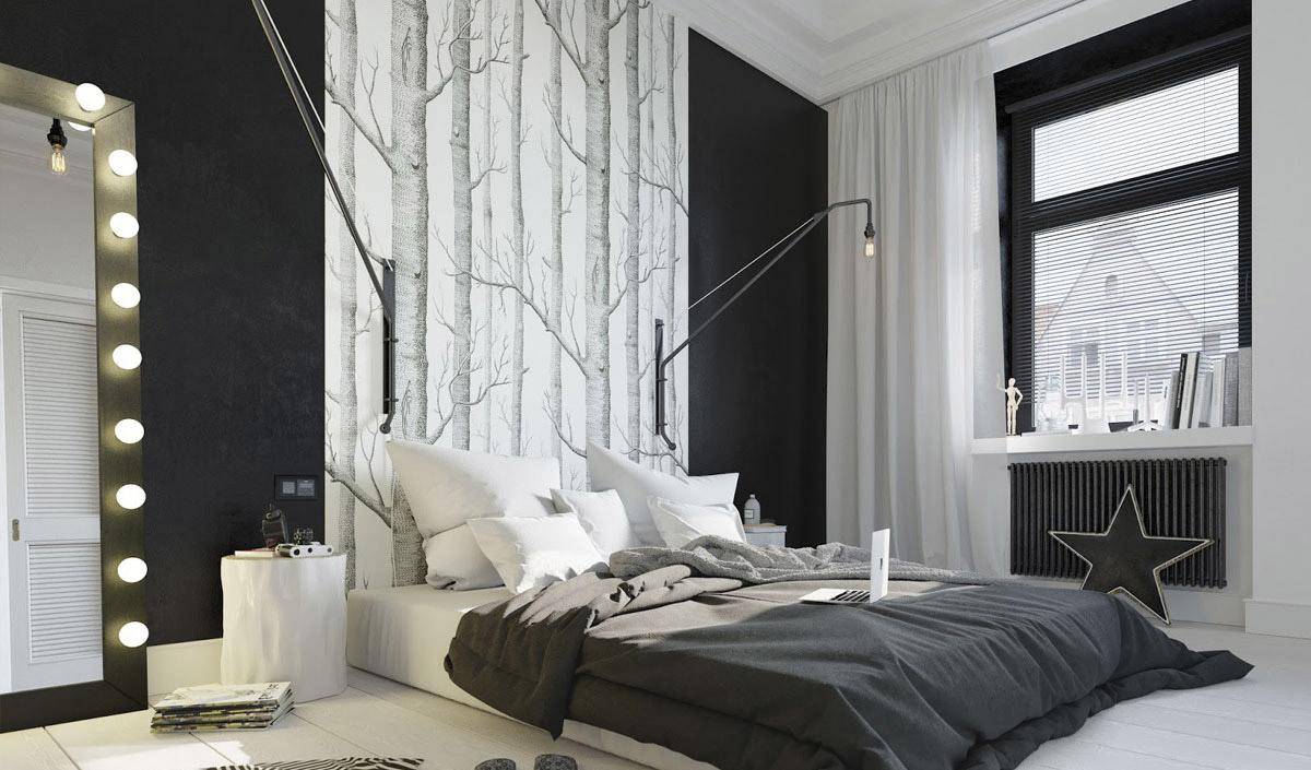 Черный, белый и коричневый цвета в интерьере спальни 16 кв м