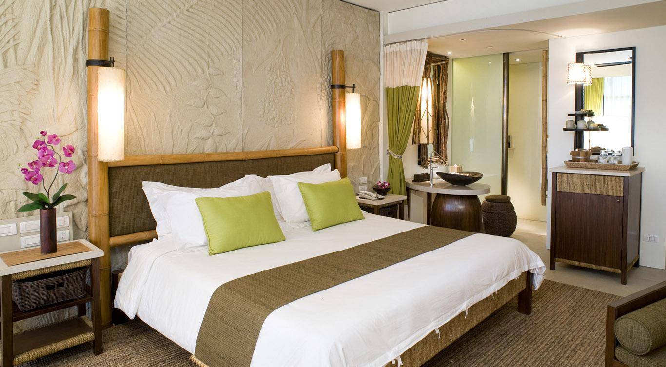 Белый, бежевый, зеленый и коричневый цвета в спальне в эко-стиле