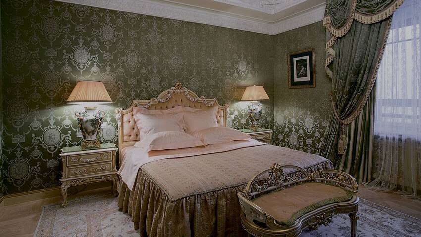Например, это могут быть виниловые фактурные обои с растительным орнаментом с позолотой. Великолепно выглядят и обои, имитирующие текстиль, которые могут быть с позолотой или с «вышивкой», в том числе блестящей.