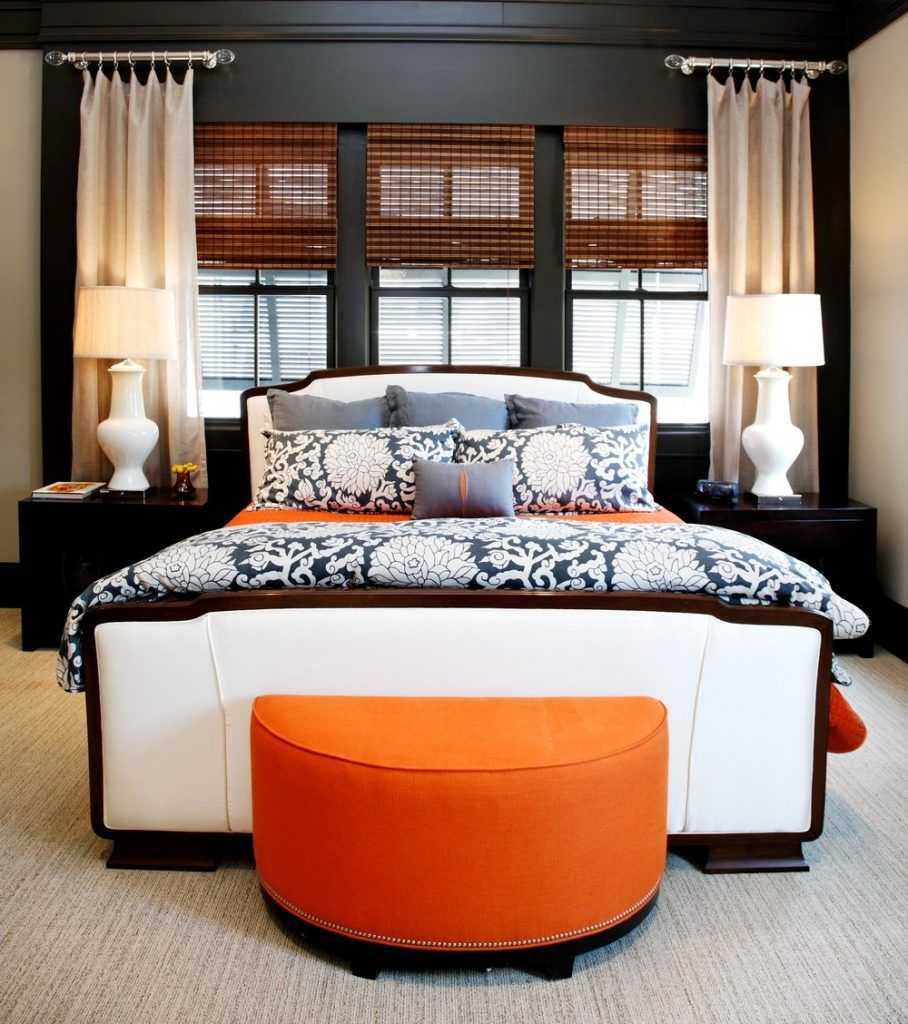 Легкий оранжевый цвет добавляется в спальню на западной стороне. Для того, чтобы задержать подольше лучи уходящего солнца, следует выбирать бежевые, песочные, коричневые оттенки в оформлении стен в спальне.