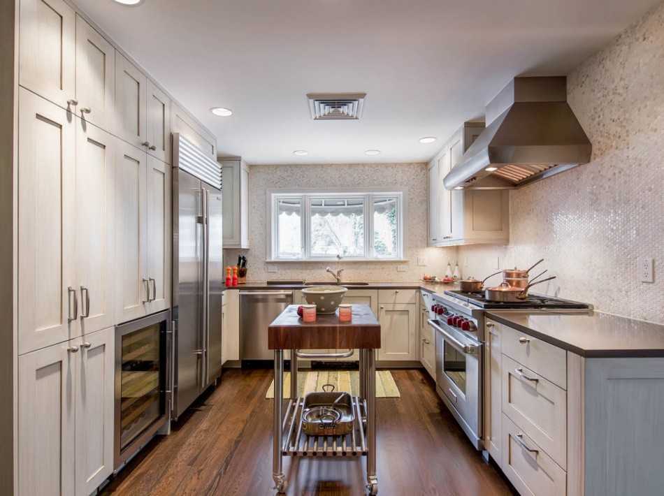 Для вытянутых и узких помещений отлично подойдет параллельная планировка при оформлении кухонного пространства. Вдоль одной из больших стен обычно располагают функциональную зону, а именно плиту, мойку, рабочую поверхность, а на параллельной ей стене устанавливают духовой шкаф, холодильное оборудование, буфет, шкафчики с красивой посудой, бар, бутылочницу и т.д.