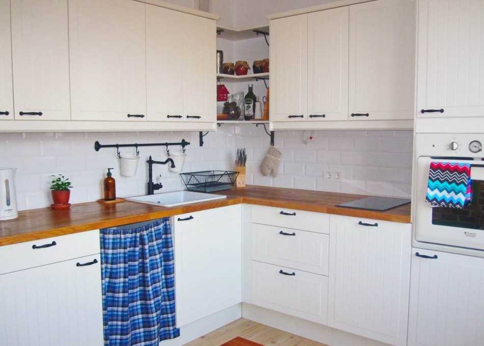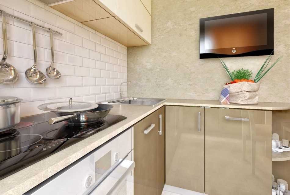 Выбор гарнитура для маленькой кухне невелик: в большинстве случаев оптимальной станет Г-образная планировка. Она отличается компактностью, задействует существенную часть пространства — две стены и угол между ними, а также делает возможным расставить мойки, плиту и холодильника по правилу «рабочего треугольника». Этот принцип расположения основных зон на кухне делает приготовление пищи удобным, сберегая время и силы хозяйки. Чтобы сэкономить площадь кухни, Г-образный гарнитур следует разрабатывать так, чтобы одна из частей была у́же другой.