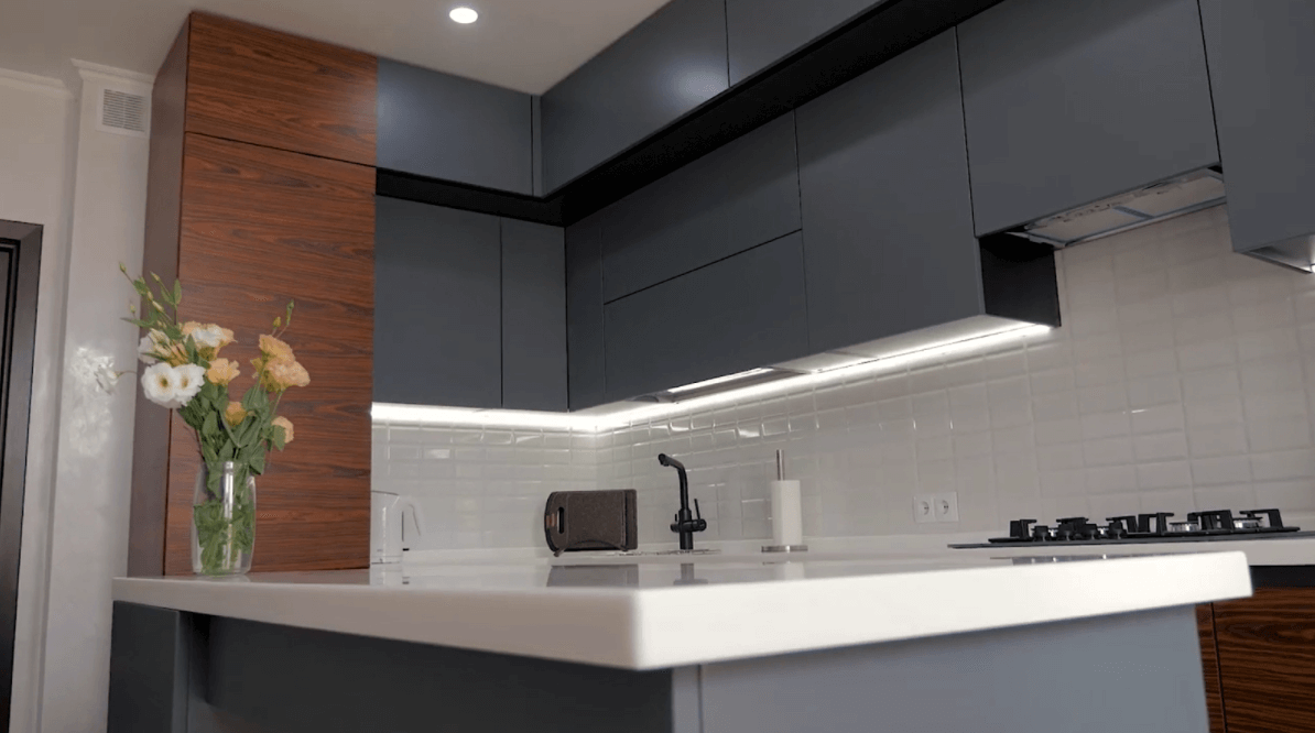 Дополнительно вешают освещение у рабочей зоны. Это могут быть как подвесные светильники, так и точечные лампы под верхним гарнитуром. Главное правило — соблюдать дистанцию от воды в 60–70 сантиметров. Такого же принципа стоит придерживаться при размещении розеток и выключателей.