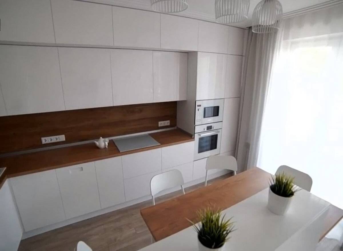- глянцевый или зеркальный гарнитур с гладкими фасадами и с фурнитурой push-to-open.