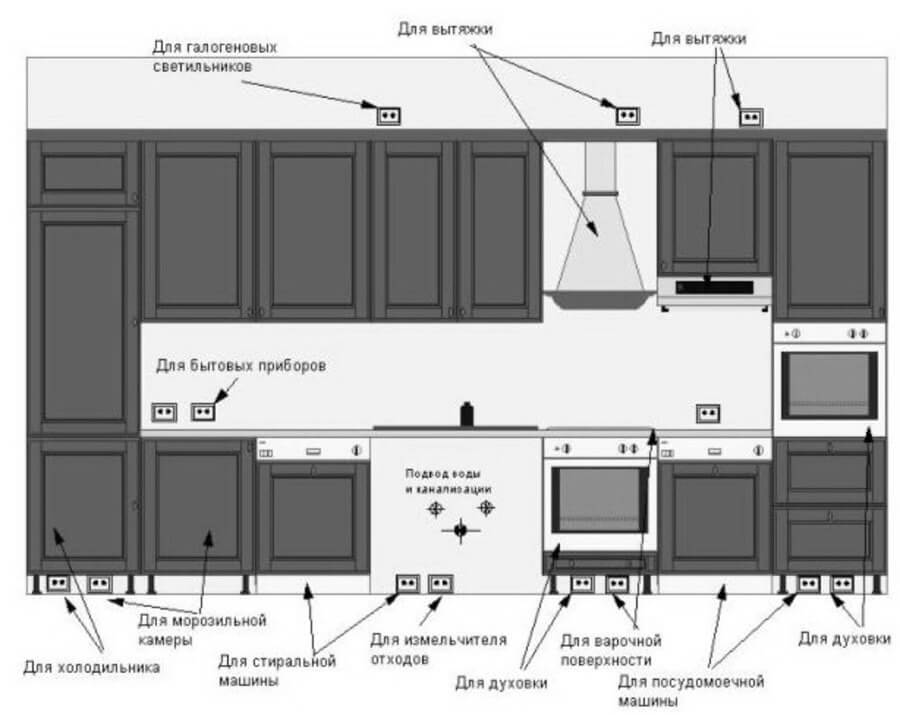 Чтобы дизайн кухни получился не только стильным, но и комфортным, необходимо установить достаточное количество розеток. Экономить на них точно не стоит — действует правило: чем больше, тем лучше. Отдельной цепью проводят электросеть к холодильнику и стиральной машине. При желании розетки можно замаскировать — тогда они не будут отвлекать взгляд своим внешним видом. На картинке изображена примерная схема расположения розеток на кухне.