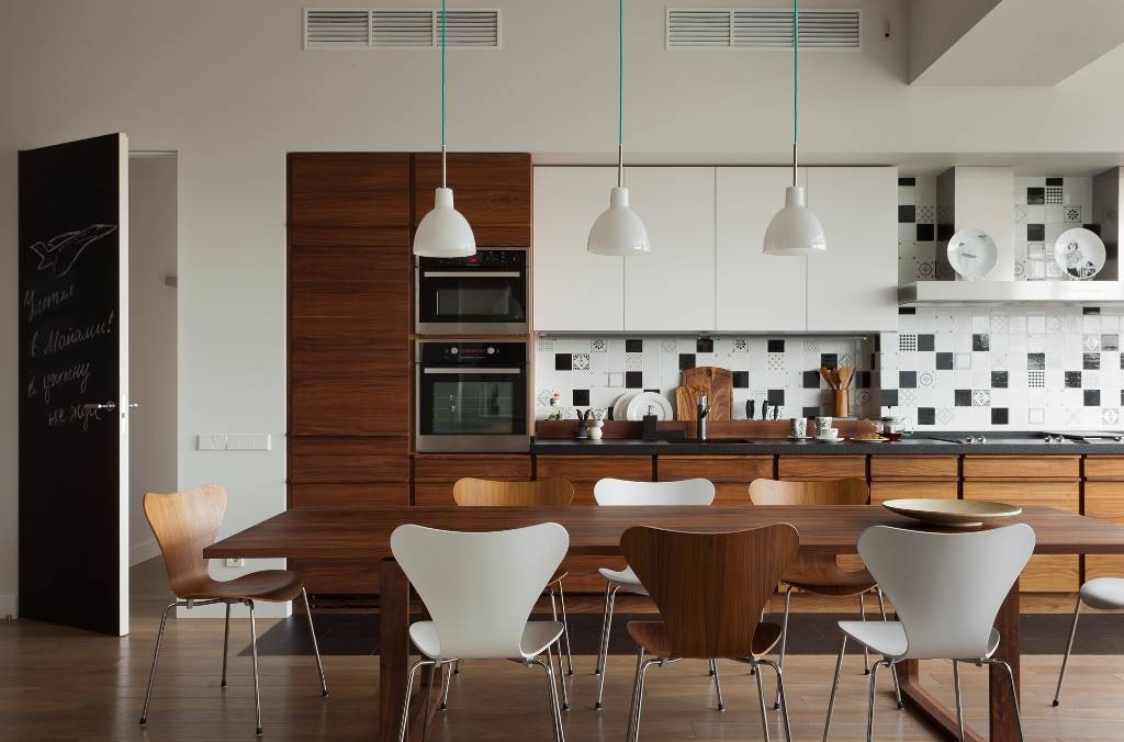 В рабочей зоне обязательно используют подсветку под навесными шкафами или на потолке в виде точечных спотов или светодиодной ленты. Здесь также будет уместен один светильник над обеденным столом или несколько аккуратных подвесов. Они должны быть компактными, но не мелкими. В последнем случае недостаток лишь подчеркнется.
