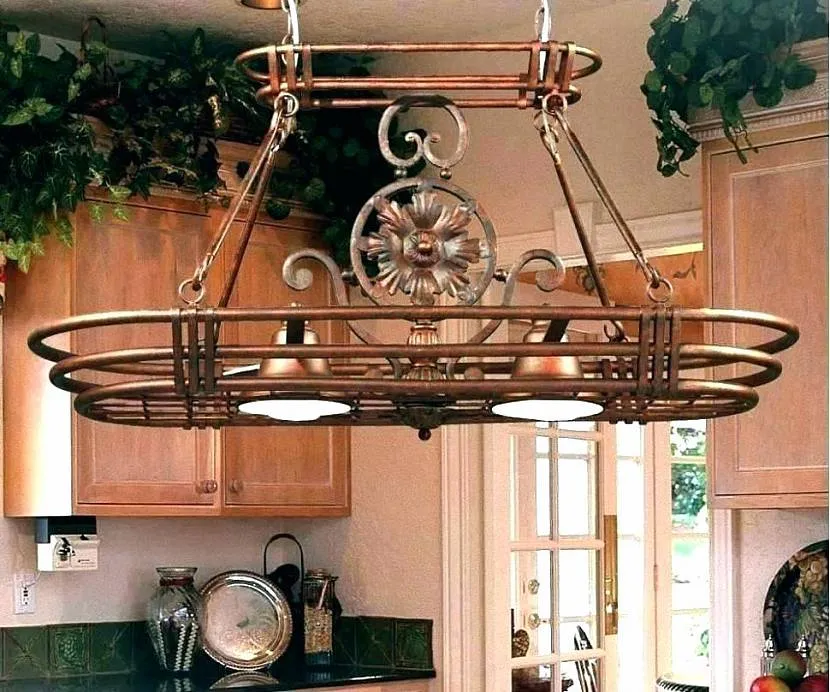 Массивная чугунная или деревянная люстра с элементами металла сложной конструкции. Округлая, в форме колеса, конусообразная, в идеале она должна висеть на цепях.