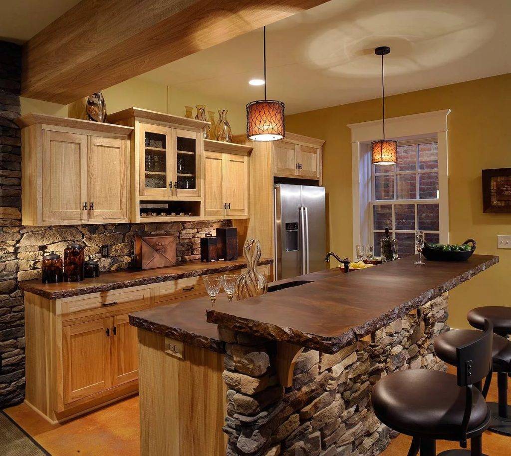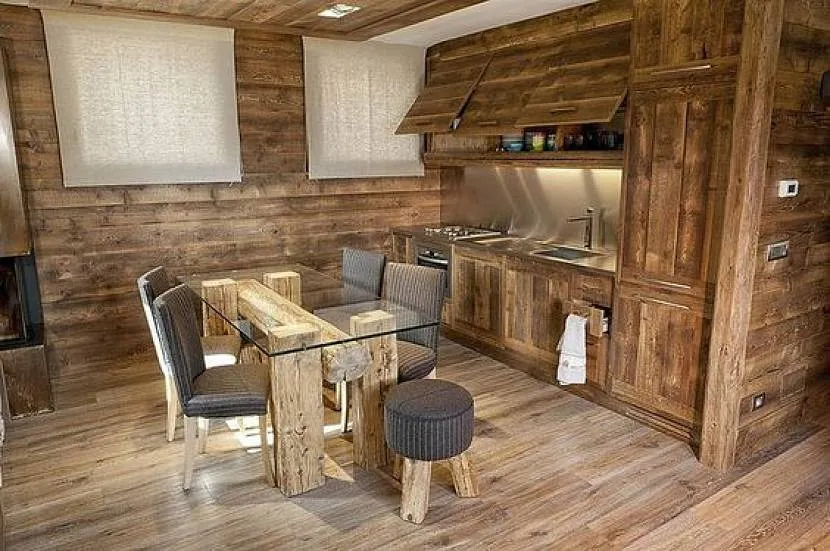Главный элемент декора стиля шале это камин. Хорошо, если он будет настоящим. Его устанавливают в углу или центре кухни. Такой вариант, скорее, возможен в загородном доме, в квартирах же устанавливают электрический. Самый простой способ дизайна – фотообои с изображением камина.