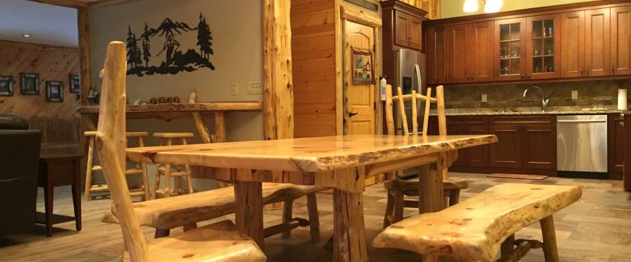 Укомплектуйте стол стульями из аналогичного материала, с обитыми темной кожей спинками или украшенными резьбой. При желании стулья можно накрыть меховыми шкурами.