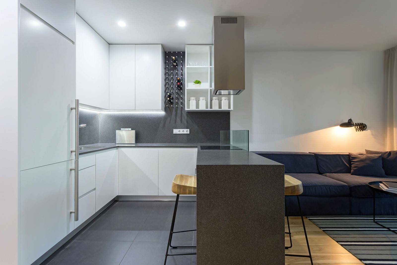 В этой кухне-гостиной полуостровом является барная стойка, также выполняющая роль небольшого обеденного стола