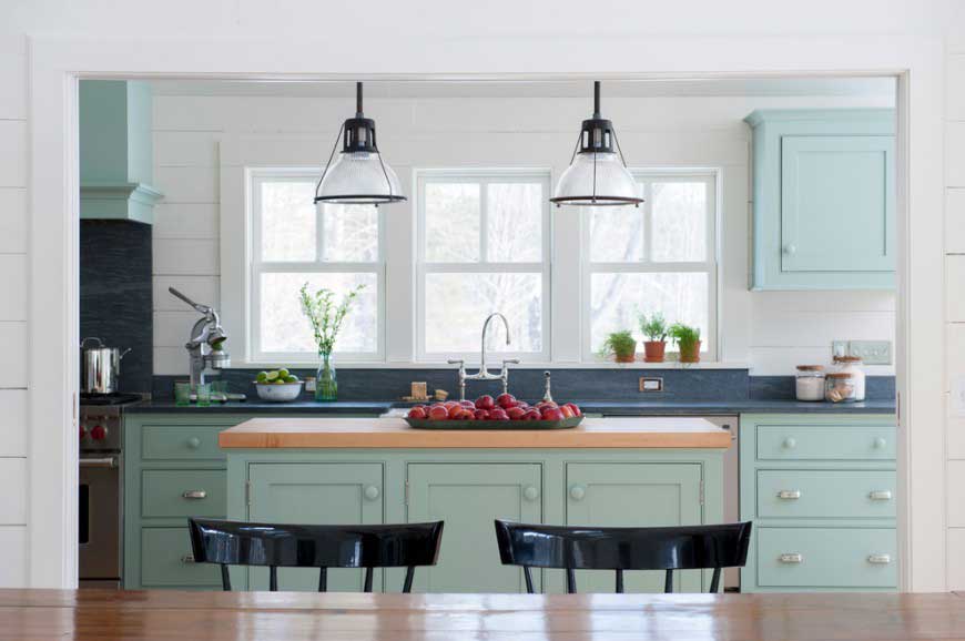 Выделяйте цветом не весь гарнитур, а его отдельные элементы – остров, верхние шкафы, отдельные блоки и секции.