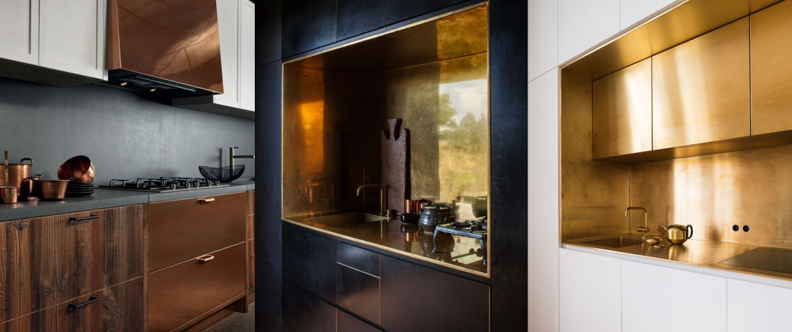 Несгибаемый тренд на натуральные материалы не обходит стороной и кухню. Новый год в дизайне интерьера благосклонен к фактуре бетона, натуральному камню и его имитации, дереву, дизайнерскому шпону и металлическим элементами. В случае последних хром уступает место золоту и латуни. Металл используется акцентно и более масштабно: в качестве фасадов кухонных шкафчиков или фартука.
