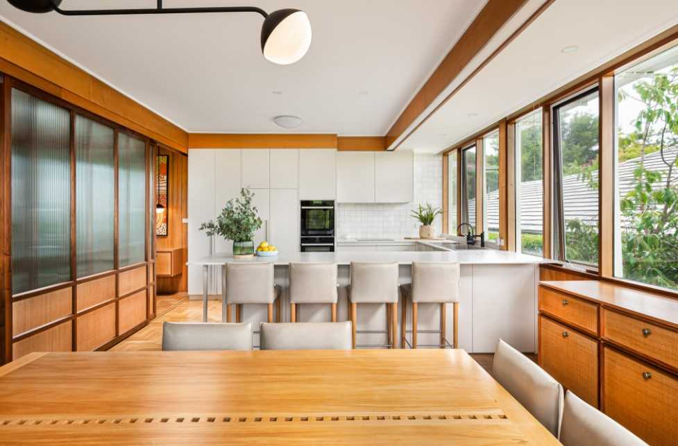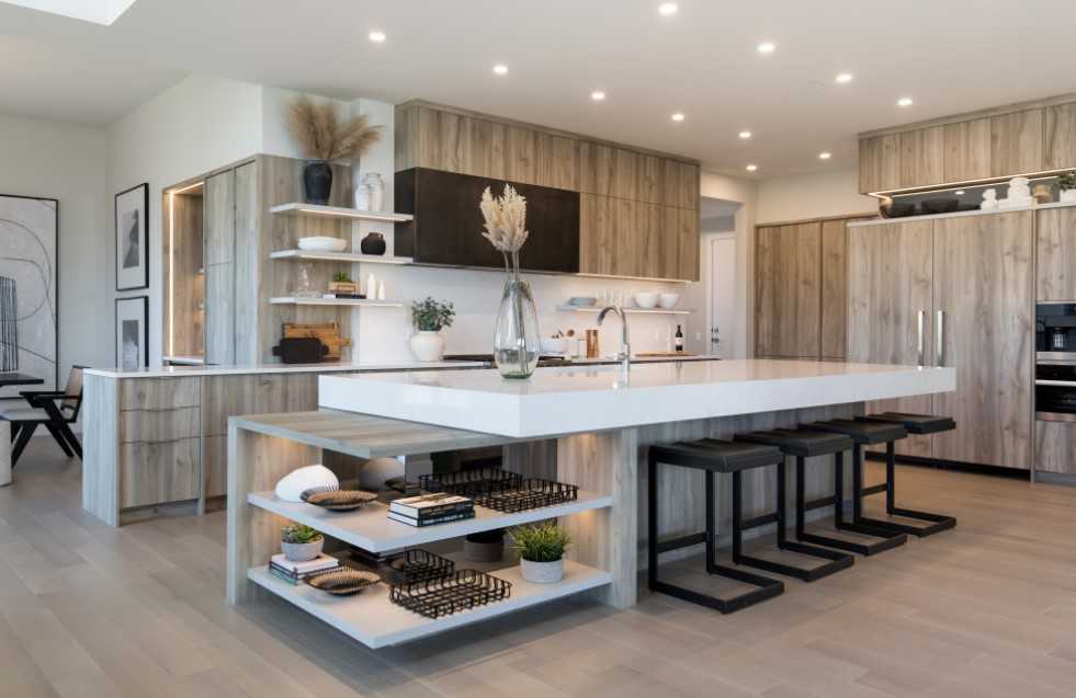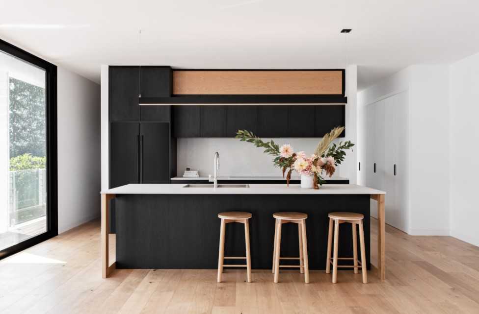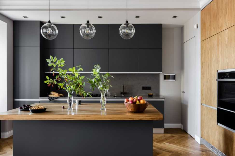 модный образ кухни помогут вставки дерева – натурального или материала, хорошо