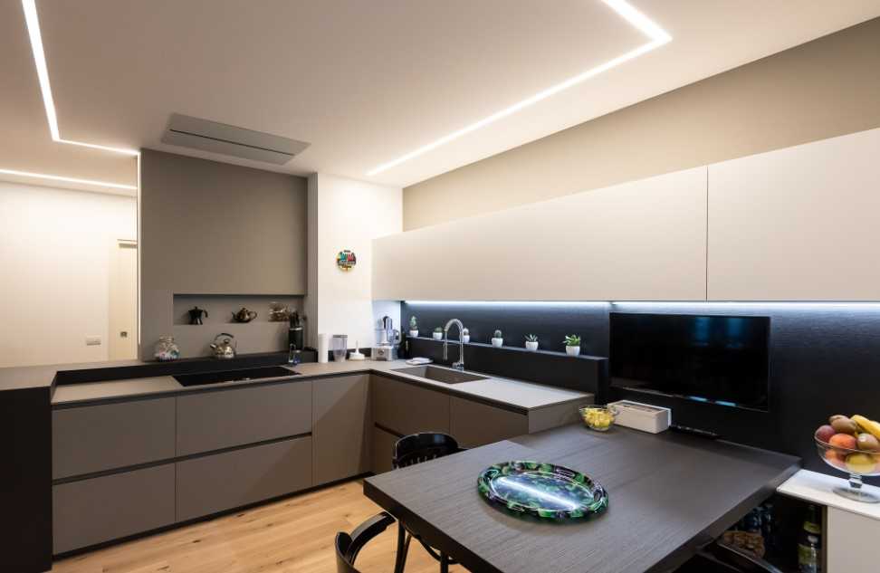 Верх гармонии — плоский смарт-светильник в центре потолка, и линейка спотов для подсвечивания рабочей или обеденной зоны. Такая комбинация не засоряет пространство, а возможность регулирования цветового потока у смарт-светильника позволяет подобрать идеальный вариант освещения в каждом конкретном случае.