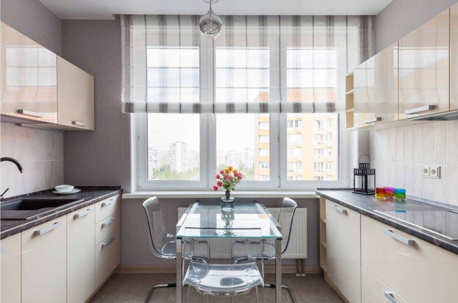 В средних и больше по площади кухнях стеклянные вставки ещё допустимы, но в маленьких будет слишком сильная перегрузка деталями.