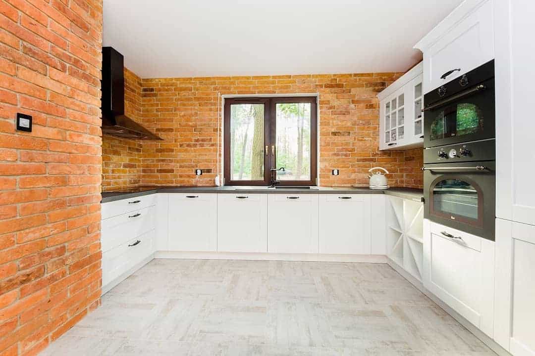 Отделка керамической плиткой, которая имитирует кирпич. Иногда оставляют черновой кирпич, но его нужно правильно обработать.