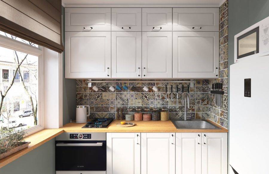 Можно окрасить стены в бежевый, песочный, любые оттенки синего, оформить фартук мозаичной плиткой, добавить мебель «под дерево» или универсальных серого или белого цветов.