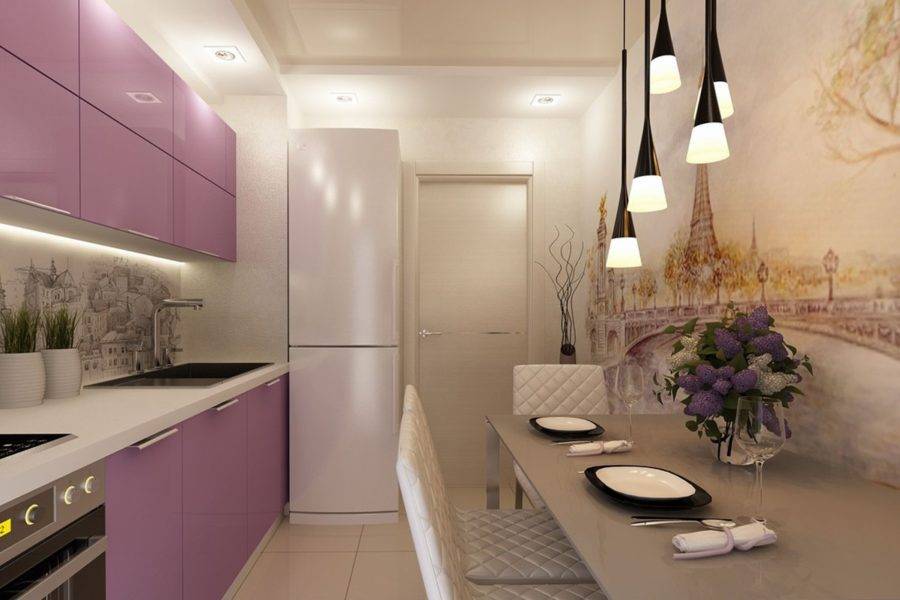 Балкон на кухне 9 кв. м обязывает размещать мебель так, чтобы выход на него оставался беспрепятственным. Для оформления кухни с балконом выбирают линейный тип размещения мебели. Если ширина позволяет, то размещение элементов дизайна может быть двухуровневым, на одной из сторон часто располагают обеденную зону.