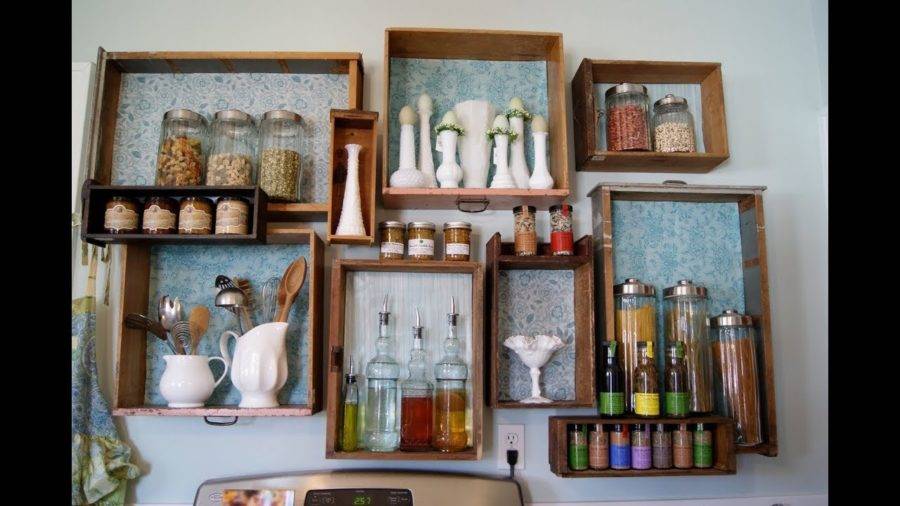 Оригинальная идея — установить цельный фартук с полками. На них можно расставить специи, столовые приборы и другие мелочи.