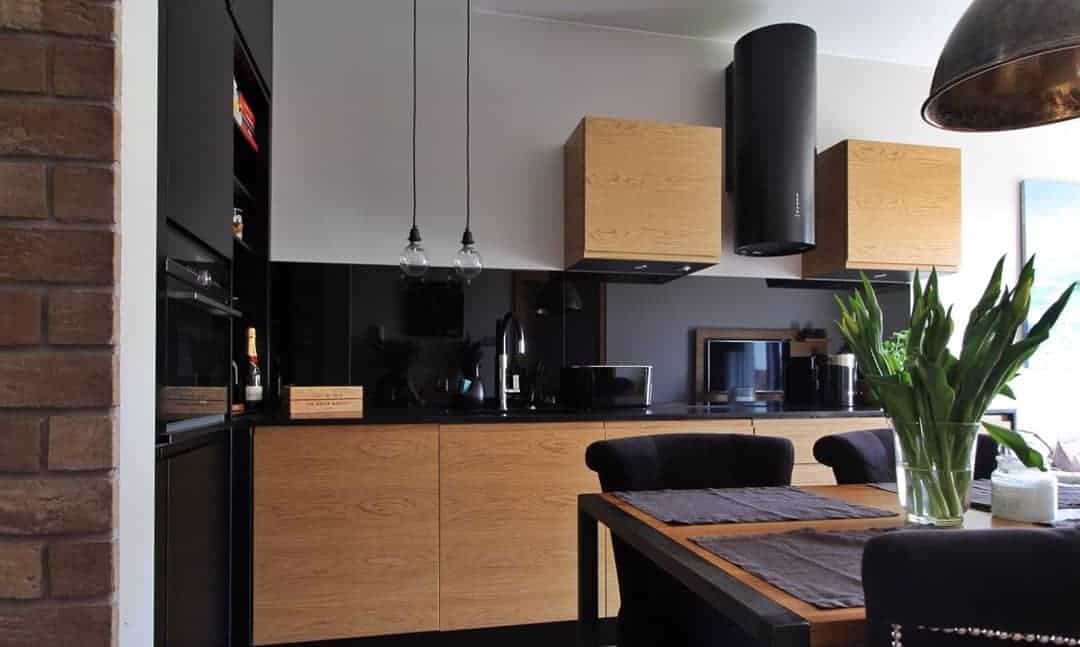 Смягчить темный цвет фасадов кухни помогут предметы мебели натуральных природных оттенков