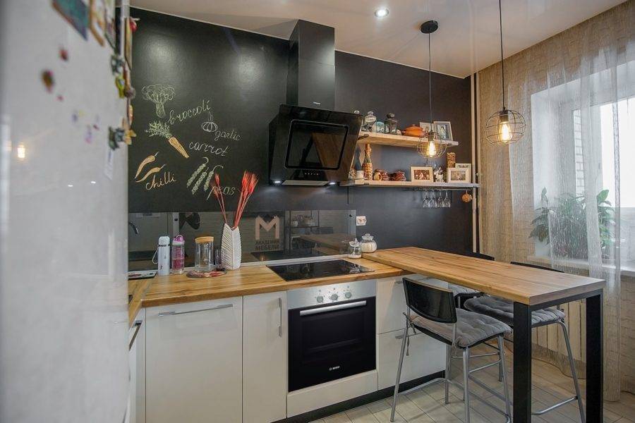 Установка барной стойки — оптимальный выбор для узкой кухни, где для обеденного стола не остается места. В такой ситуации небольшую барную стойку оборудуют у стены с окном, для удобства можно сделать ее откидной.