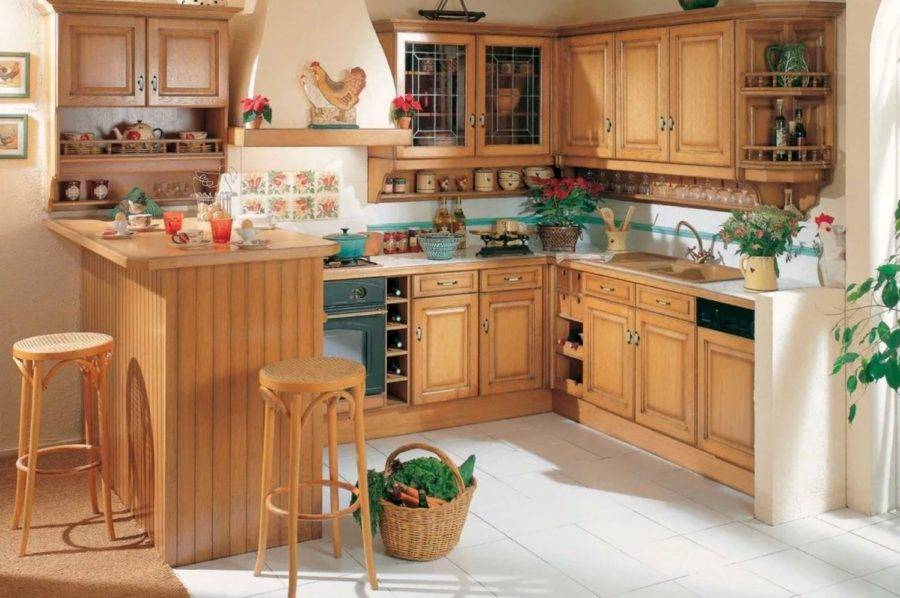 - Цвет кухонной мебели – древесный. Фасады должны быть из натурального дерева (ДСП и МДФ со шпоном не подойдет). Варианты кухонных гарнитуров отличаются. Фасады могут сочетать разные пароды, отличающиеся тонально. Текстиль натуральный: лен и хлопок. Шелк не приветствуется.
