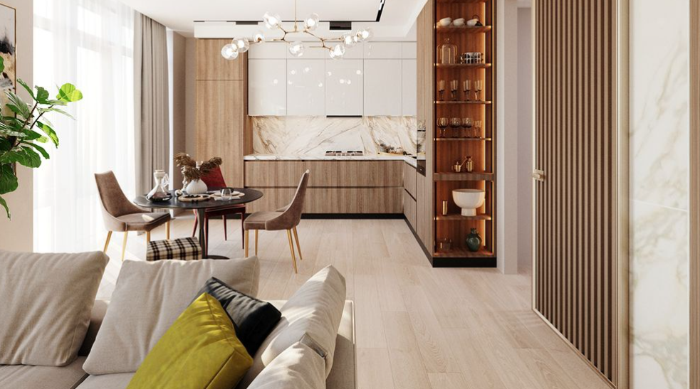Такая кухня 2023 современная – это помещение, которое легче разделить на функциональные зоны.