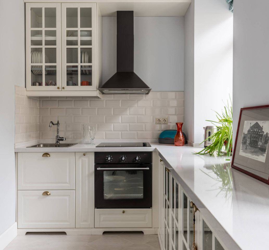 Совет: если установить на маленькой кухне Г-образный гарнитур, то можно освободить противоположный угол для небольшого столика для одного или двух человек.