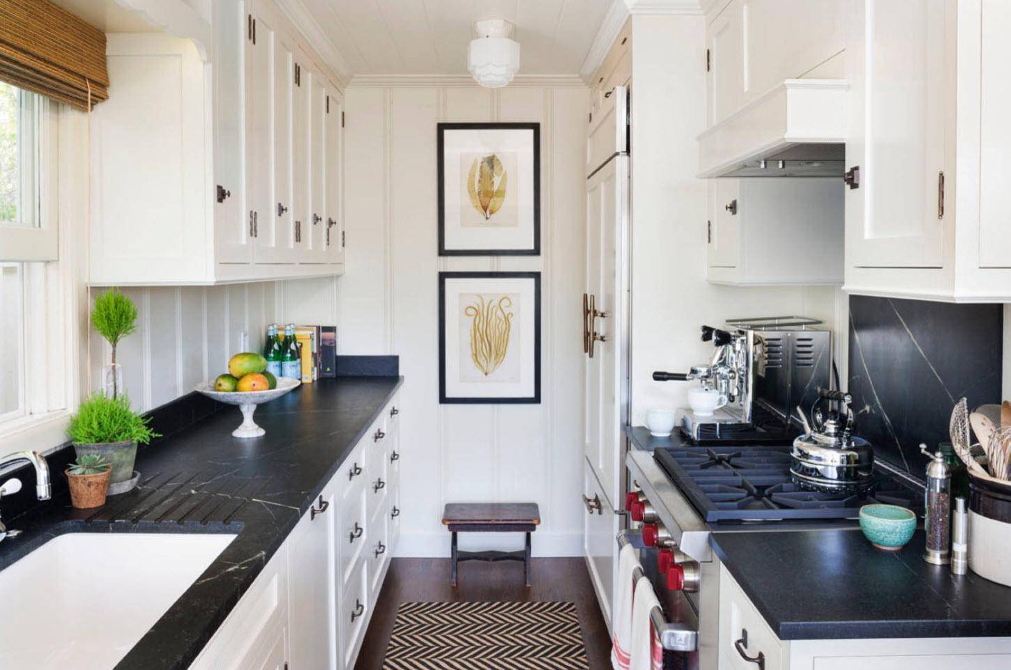 Некоторым талантливым дизайнерам удается придумывать, как сделать красивую и функциональную маленькую кухню при двухрядной или П-образной планировке. Однако лучше не рисковать и использовать проверенные варианты расстановки предметов: