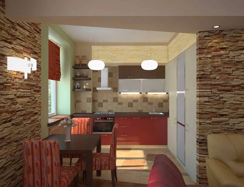 Комнату для приготовления пищи часто объединяют с утепленным балконом или лоджией. На месте демонтированного оконного блока ставят барную стойку или этажерку с полками. На освобожденных метрах можно разместить столовую.