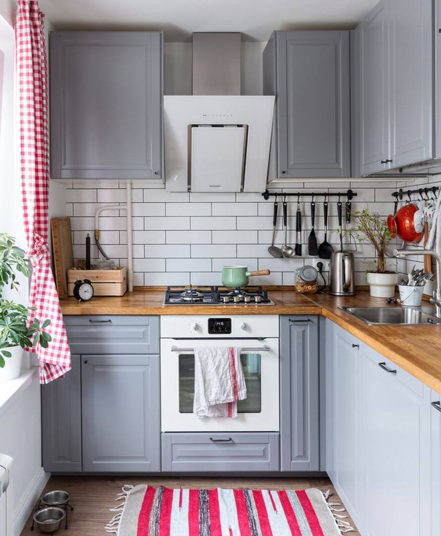 Навесные шкафы на маленьких кухнях предлагают место для хранения вещей, но визуально добавляют пространству объем.